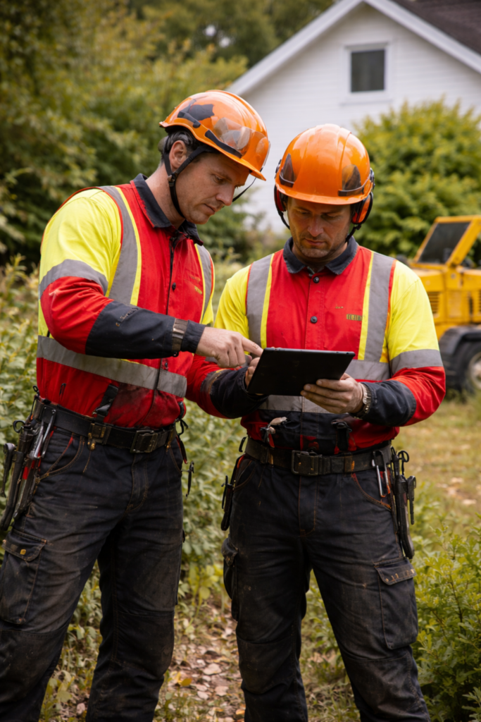 Når vi utfører trefelling vurderer vi alltid området rundt treet først. Vi ser på avstand til bygg, strømledninger og andre hindringer før arbeidet starter. Dersom treet står i et trangt område, benytter vi seksjonsfelling der treet tas ned bit for bit.