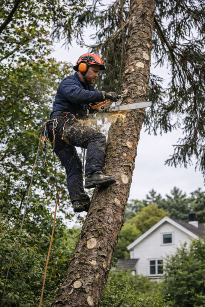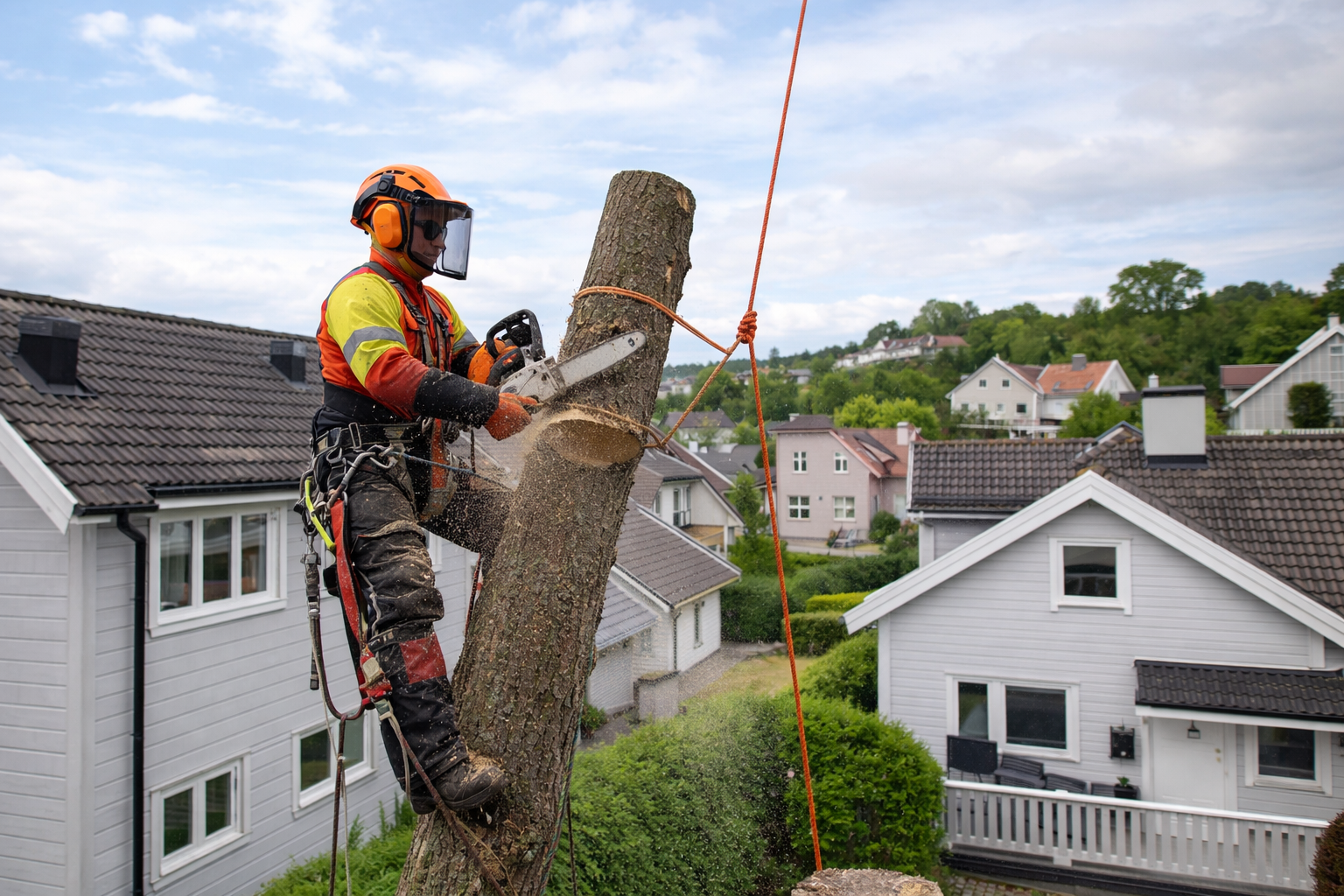 Trefelling krever riktig kompetanse og utstyr for å utføres sikkert. Våre erfarne fagfolk vurderer alltid forholdene rundt treet og velger den tryggeste metoden for fjerning. Ved behov benytter vi seksjonsfelling, hvor treet tas ned i mindre deler for å unngå skade på bygninger eller omgivelser.